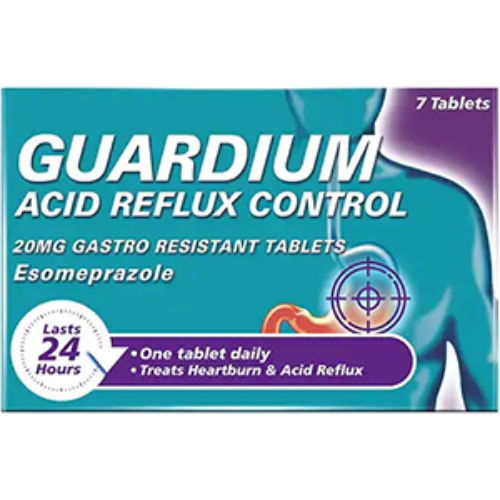 Guardium Acid Reflux Control 20mg Gastro Resistant Tablets is a short-term treatment for reflux symptoms (for example, heartburn and acid regurgitation) in adults. They contain the active ingredient esomeprazole, a proton pump inhibitor that works by reducing the amount of acid that your stomach produces.